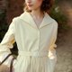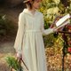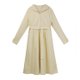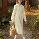 美しくロマンチックでレトロな雰囲気のある坂の中の黄色を持っています。まるで映画の中に包まれているあの柔らかな光のようです。ロングスカート、しわ、折り襟、楕円の日の字のボタン…フランス風のレトロな趣があります。全綿の生地と裏地、前胸の服の柄は八の字に、斜めに切って、それに大きいスカートの振り子を加えて、ほとんど材料を消耗して小さくて、両側はつづり合わせの紋様の大きいほった袋があって、腰の間はしわを縮めて、更によく動いて、袖は内に固定して1つの大きいひだを形成して、簡単な随意性~