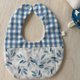 ライトグレーの生地をベースに、濃淡のブルーの葉っぱと白い丸い花をあしらい、差し色として同じブルーのチェック柄の生地を合わせて、単調ではない元気な印象に仕上げました。