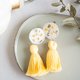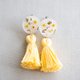 - 本物のお花を中にとじ込めたタッセルピアス。 ミモザのドライフラワーとミントの葉っぱを入れてパーツを作りました。 黄色いタッセルも手作り。200色ほどあるフランス製の糸の中から、ミモザの黄色にあう色を選んで作りました。