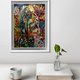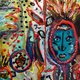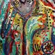 ガラスの上に描かれたこの作品は、ステンドグラスの効果と表現力豊かな油絵の層を組み合わせており、鮮やかな色彩の深みと触覚的な表面のコントラストを生み出しています。大胆な輪郭線、半透明の色彩、そして質感のある絵具の塗布が光と相互作用し、作品の視覚的な強度と象徴的な深みを高めています。