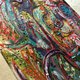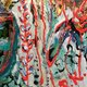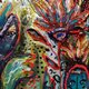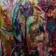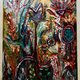 鮮やかな赤、ターコイズブルー、深い緑、黄金色の黄色、そして暗いアクセントが特徴的なパレットです。これらの色彩は、成長、神秘、そして生命力を呼び起こし、層になった構図は作品全体に動きとリズムを生み出しています。ムードは神秘的でエネルギッシュ、そしてやや謎めいています。