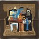 この鮮やかでダイナミックな構図の中で、ピカソはイタリアの喜劇に登場する衣装を着た仮面をつけた3人の人物を描いています。