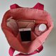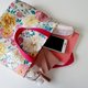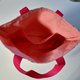 ピンクは、持ち手は元気よくビビットピンクを使用し、内側の布は表の花柄のピンクとも合うように濃いめのサーモンピンクを選んでみました。