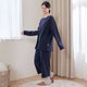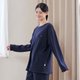 トップスの半円ポケットとパンツの繊細な刺繍が互いに引き立て合い、活気あふれる印象を与えます。