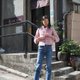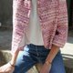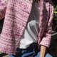- ショッキングピンクの花の中国の唐のスーツのコート このコートは、裾にフリンジが付いた粗い花柄の生地で作られています