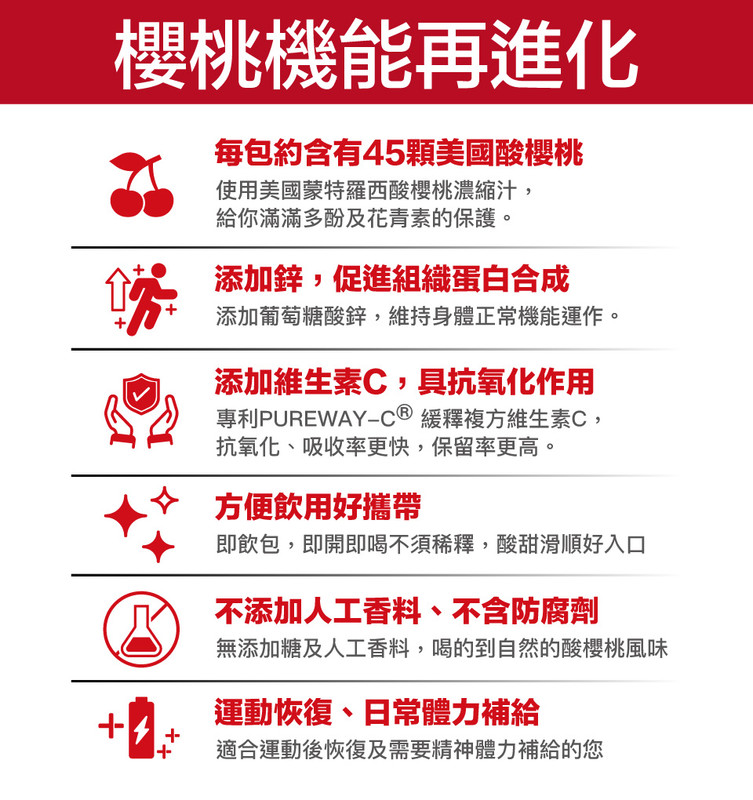- Taiwan's first sour cherry machine energy drink 50ml (10 packs) ✔ Added vitamins, zinc gluconate and deep ocean minerals ✔ Helps the body repair ✔ Provide daily spiritual supplies ✔ Ready to drink, no need to dilute You can recharge your energy with cherries at any time! ReCharge before you go again!