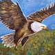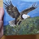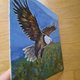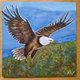 緑豊かな森に覆われた山々の上を、雄大に力強く飛翔するハクトウワシの姿。