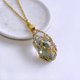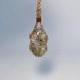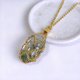 - 天然のグリーンファントムクォーツ。透明でガラス質、鉱物を完全に内包しています。高山の松の木の青緑色を思わせる色合いです。美しい形状です。真鍮製のチェーンポーチネックレス。先端に留め具が付いているので、短めに着用できます。