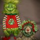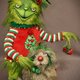 グリンチは、ヤドリギのリース、ホリデースウェーター、そして手にクリスマスの飾りを持っています。すべてのアクセサリーは、このクリーチャーのために特別に手作りされたもので、帽子とセーターは着脱可能です。