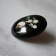 深い黒の天然石に、やわらかな色合いの花と鳥、金箔の輝きが美しく映え、さりげなくも物語性のある後ろ姿を演出します。