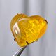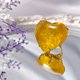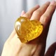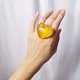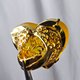 デザイナーは、フローライト家族の中でも**最も希少**な**イエローフローライト**を厳選し、堂々としたハート形(**願望成就、慈悲の心**)に丁寧に磨き上げました。さらに、精巧な**ハート模様**を施し、**立体的で透かし彫り**の華やかなリング台(純銀にイエローゴールドメッキ)にセッティング。リングの台座の下(**窓**)からは、このイエローフローライトの高い透明感がご覧いただけます。