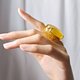 **1.写真のイエローフローライトのリングトップ全体は高さ約38mm、幅42.6mm、厚さ19.5mm。リング内径は約17.2mmで、フリーサイズ調整可能です。**
