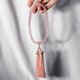 素材: 天然ローズクォーツ(芙蓉晶)、正絹(蚕糸)、人絹(再生繊維)