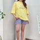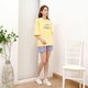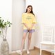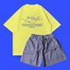 - セット内容:柔らかなイエローのコットンTシャツと、ブルーのストライプショートパンツが含まれています。