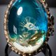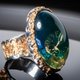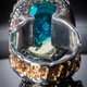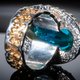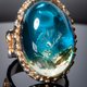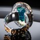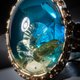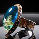 このユニークなリングは、希少なブルーアンバーを使用。自然のきらめくインクルージョン(内包物)が光を受けて美しく輝きます。一つ一つ異なるインクルージョンの表情が、奥行きと、他に再現できない神秘的な内なる輝きを生み出しています。