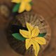 インスピレーションは、朝の光に揺れる百合から。ふっくらと張りのある明るい黄色の花びらは、平坦な表現ではなく、絶妙なカーブで幾重にも重なり、自然に咲き誇る花の豊かな姿を模倣しています。力強い色彩と質感のコントラストは、まるで生き生きとした小さな枝を、そのまま髪に飾ったかのようです。