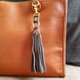 柔らかなオリーブグリーンスエードのタッセルは穏やかに揺れ、