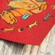 本作は、金色の繊維が織り込まれた赤い紙に、五色すべて手刷りのシルクスクリーンで表現されています。光の加減でほのかに輝く紙は、繊細で独特な質感をもたらします。