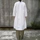 - 20世紀初頭に作られたアンティークのリネンワンピース。自然な色合いのリネン生地は、厚みと軽やかさが混在し、重厚感と優雅さの両方を感じさせます。首元や胸元のギャザー、厚みのあるシェルボタン、手縫いのボタンホール、脇下やスカート両サイドのパネル状の縫製、そして赤いイニシャル刺繍など、細部に至るまで時代の息吹を感じさせる一着です。