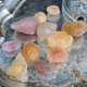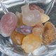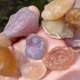 写真では、甘い7色の生のキャンディーストーンの束が、それぞれ異なる形状、異なるスキン、異なるキャンディーハートを持っています。