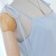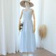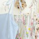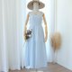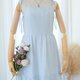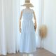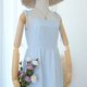 ロングドレス、コットン生地、膝丈のスカート、後ろのジッパー、裏地付き、蝶ネクタイ、ショルダーストラップ。