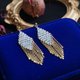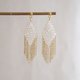 こちらのムーンストーンフリンジピアスは、光の加減で幻想的な輝きを放つファセットムーンストーンビーズを厳選し、細い金線で一つ一つ手編みで菱形に仕立て、その下にゴールドのフリンジをあしらいました。揺れるたびに、光の筋も優雅に揺らめきます。