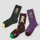 【「森の密会」シリーズのデザインファンタジー:「森の密会」はレトロなイラストスタイルで、秋の森で起こる童話のような出会いを描いています。三足の靴下はそれぞれ苔の緑、ベリーの紫、松の茶色を採用しており、夜が降り注ぐ森にかすかに現れるような神秘的な色合いが漂っています。靴下の上には、まるで秘密の集まりをしているかのような、繊細な装いのウサギが描かれています。】