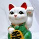 招き猫は左手に金塊を握り、尽きることのない金運と富を象徴しています。右手は大きく振り上げ、幸運と幸福を招いています。