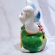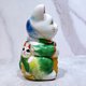 この清水焼の招き猫は、精巧な手仕事で丁寧に作られ、エメラルドグリーンの着物の繊細な模様が描かれ、社会の繁栄と希望を象徴しています。