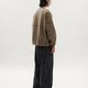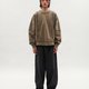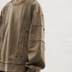 - 380gのヘビーウェイト裏毛生地を使用し、フロント両サイドには外縫いの切り替えラインを施しました。長めの縫い代を残し、二重の飾りステッチを入れ、端にはフリンジのディテールを残すことで、レイヤード感を加えています。袖は上下でずらした切り替えデザインを採用し、着用時のプロポーションに全体的な視覚的変化をもたらします。