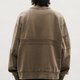 380gのヘビーウェイト裏毛生地を使用し、フロント両サイドには外縫いの切り替えラインを施しました。長めの縫い代を残し、二重の飾りステッチを入れ、端にはフリンジのディテールを残すことで、レイヤード感を加えています。袖は上下でずらした切り替えデザインを採用し、着用時のプロポーションに全体的な視覚的変化をもたらします。