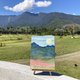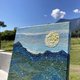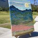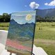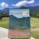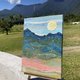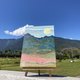山々の層を線とカラーブロックで表現したシリーズ作品で、ペインティングナイフにより山や岩の立体感と力強さを表現し、交差する長いカラーブロックは太陽が降り注ぐ森の様子を表現しています。自由に揺れる絵の具は、木の梢を照らし、森を通り抜け、山のあらゆる草木にキスをする散乱する光線を表現しています。