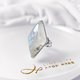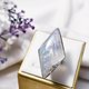 デザイナーは厳選された高品質の**ブルー・ムーンストーン**を使用し、**ひし形**に研磨されたリングの表面は、**レインボーブルーの光**が煌めき、透明感のある結晶と美しい水光が特徴です。黒点や鉱物欠陥が非常に少なく、優れた光沢を放ちます。