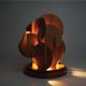 fofo lab は、PLUZ の造形手法を用いて、この卓上ランプを制作しました。20 枚の異なる形状を持つチェリーウッドの板が無秩序に交錯し、ひと目では判別できない立体形を形づくっています。灯りを点けるその瞬間、光は板と板の角度や隙間から反射し、あふれ出し、無秩序だった木片たちは光と影の変奏を奏でる器へと姿を変えます。