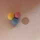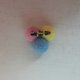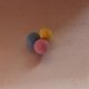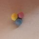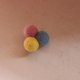 天然青染料、ラック昆虫、ソフォラジャポニカの花で染めた3種類の天然植物染めウールで作った小さなボールを三角形のピンに縫い付けたシンプルでキュートなボール。