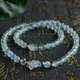 - このダブルブレスレットは、6mmの透明感あふれるアクアマリンの丸玉を使用し、淡く澄んだスカイブルーの色合いが特徴です。クリスタルは透明で、微細な氷の結晶と柔らかな光沢を帯びています。一方のブレスレットには同系色のアクアマリンのクローバー彫刻とシルバービーズがあしらわれ、もう一方には天然の南紅氷飄蓮花彫刻とカット水晶ビーズが配され、繊細で奥行きのあるディテールが魅力です。