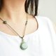 手織りのライト グリーンとライト グレーのコードと組み合わせたライト ブラウンのコイルは、リンクと装飾の役割を果たします。同色のラウンドカードスペーサーとグアテマラジェダイトのスペーサーを合わせ、仕上げは同色のオールドシェイプビーズを合わせました♪ 仕上げはアジャスタブルで着けやすさと長さ調節が可能!