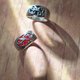丸みを帯びたリングがレッドアゲート、黒瑪瑙、またはラピスラズリを包み込み、